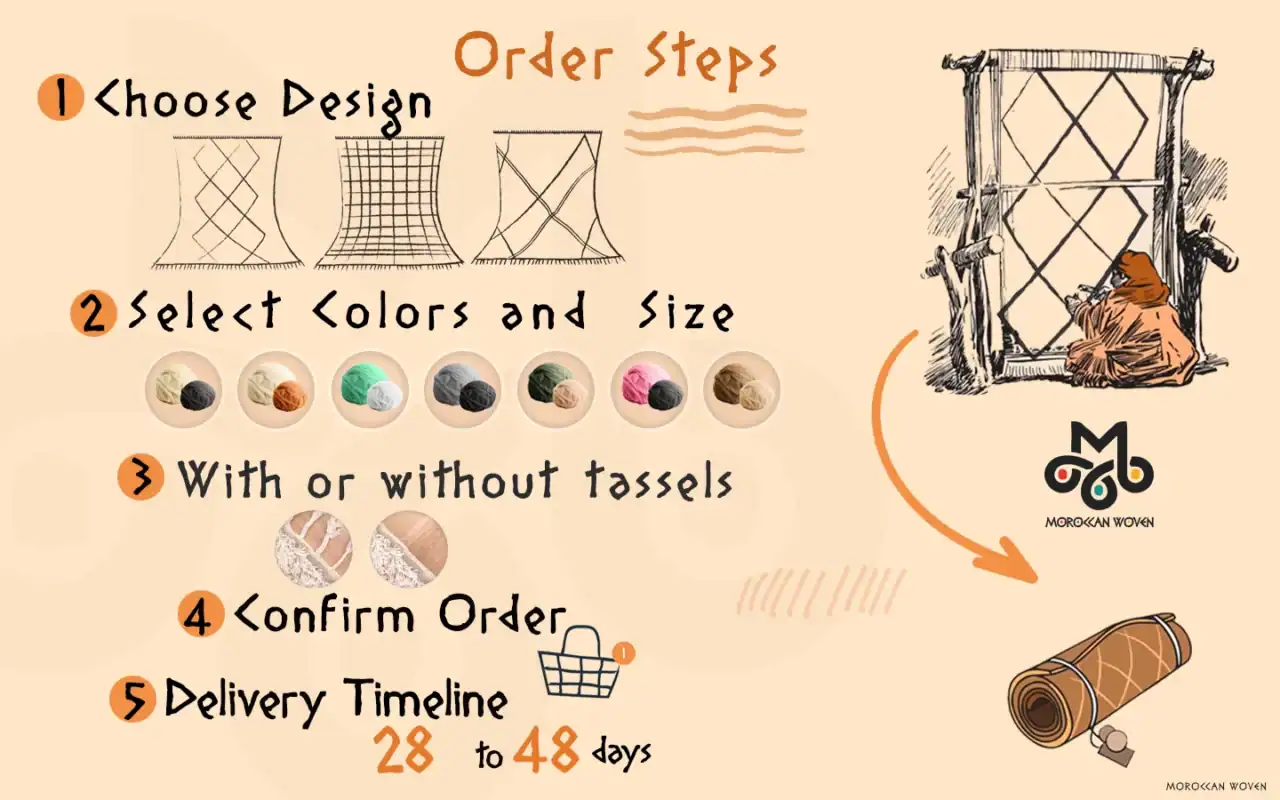 At Moroccan Woven, we specialize in creating custom Moroccan Berber rugs tailored precisely to your personal style and design preferences. Each handwoven Berber carpet is carefully crafted by skilled artisans and completed within our guaranteed 6-week production timeframe, with regular progress updates and weaving process photos shared whenever possible.