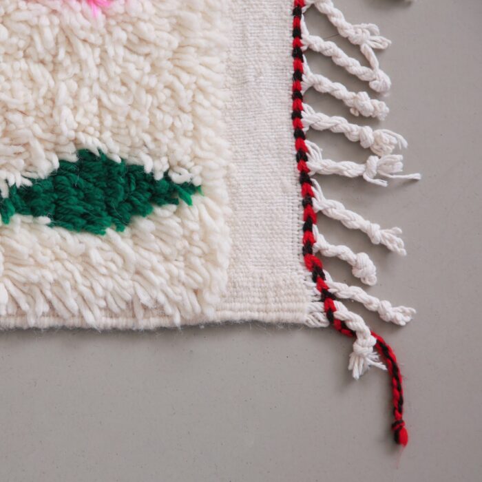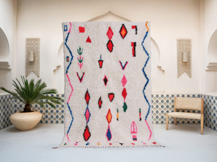 Our luxurious – Aylin Rug is a standout piece from our handwoven collection, crafted with precision and care by talented Berber artisans from the High Atlas Mountains in Morocco. Renowned for their exceptional craftsmanship, Azilal rugs are made using a blend of natural wool and cotton, offering a distinctive texture and vibrant color combinations that elevate any interior design.