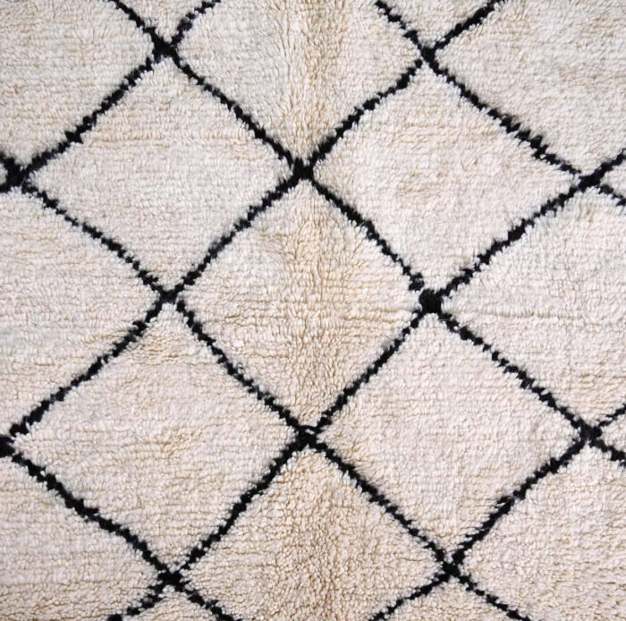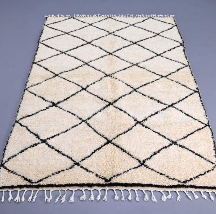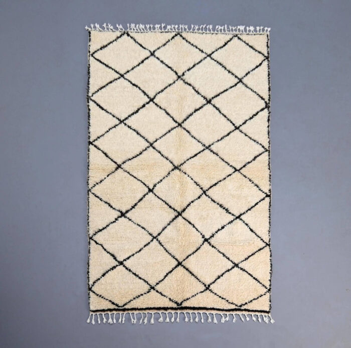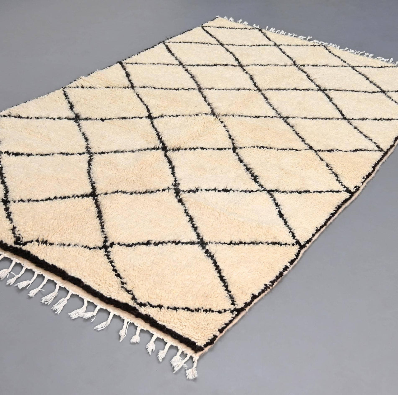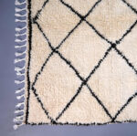 Moroccan Rug, Beni Ourain rug 100% thick and natural wool with fringed finishes on the edges. Exceptional and unique piece handmade by Berber women on wooden looms.