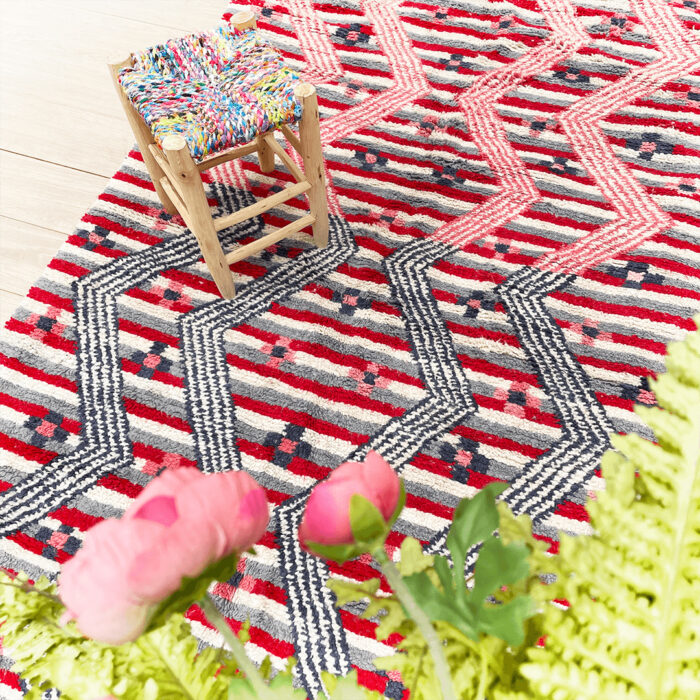 Our luxurious – Sekkura Rug is a standout piece from our handwoven collection, crafted with precision and care by talented Berber artisans from the High Atlas Mountains in Morocco. Renowned for their exceptional craftsmanship, Azilal rugs are made using a blend of natural wool and cotton, offering a distinctive texture and vibrant color combinations that elevate any interior design.