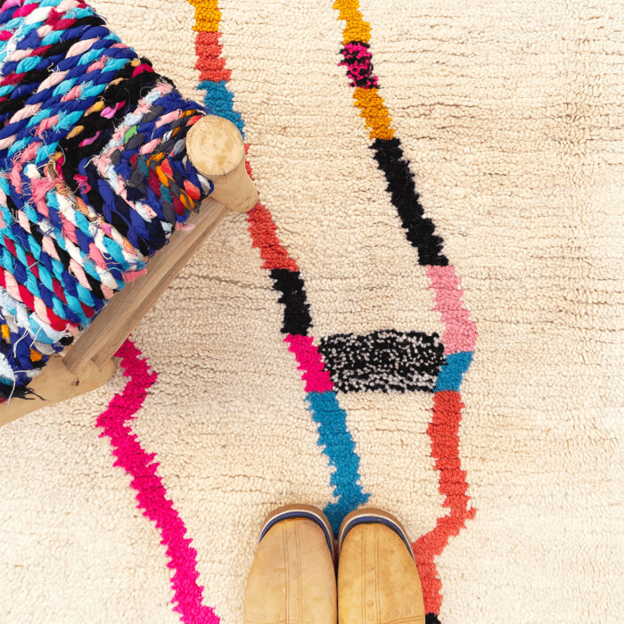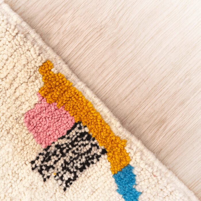 Our luxurious – Tafunast Rug is a standout piece from our handwoven collection, crafted with precision and care by talented Berber artisans from the High Atlas Mountains in Morocco. Renowned for their exceptional craftsmanship, Azilal rugs are made using a blend of natural wool and cotton, offering a distinctive texture and vibrant color combinations that elevate any interior design.