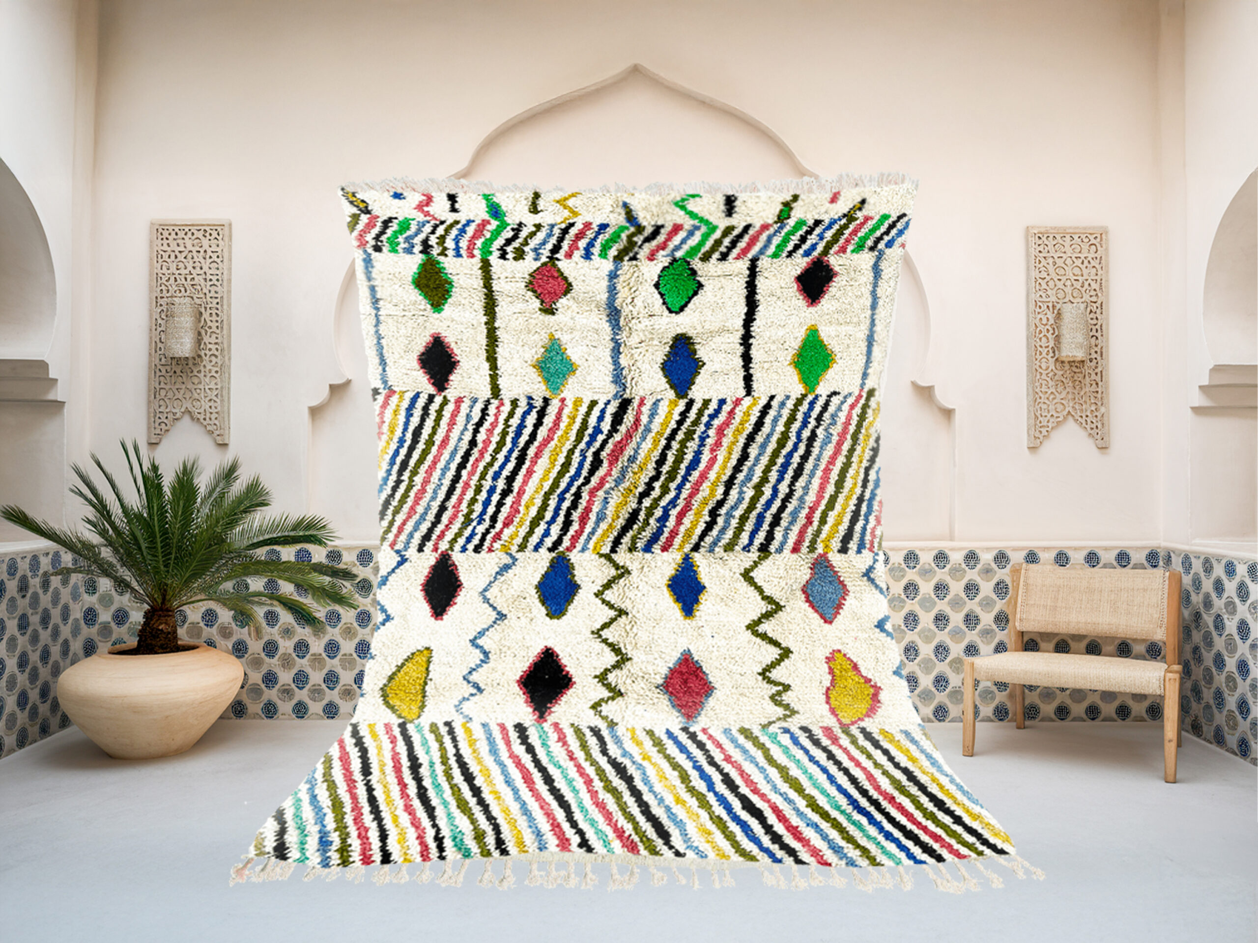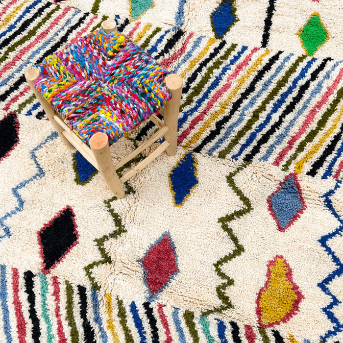 Our luxurious – Talil Rug is a standout piece from our handwoven collection, crafted with precision and care by talented Berber artisans from the High Atlas Mountains in Morocco. Renowned for their exceptional craftsmanship, Azilal rugs are made using a blend of natural wool and cotton, offering a distinctive texture and vibrant color combinations that elevate any interior design.