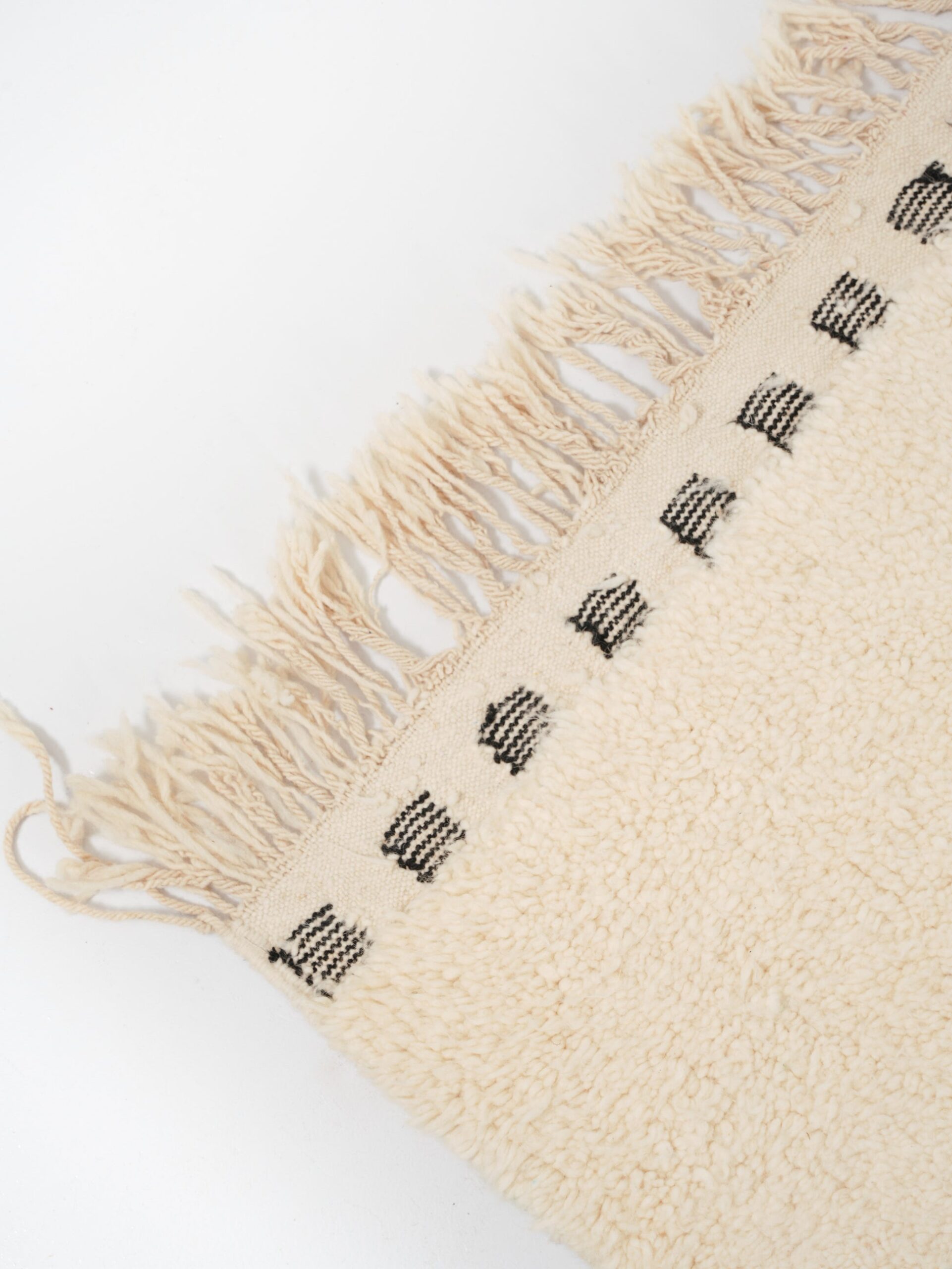 Moroccan Rug, Beni Ourain rug 100% thick and natural wool with fringed finishes on the edges. Exceptional and unique piece handmade by Berber women on wooden looms.