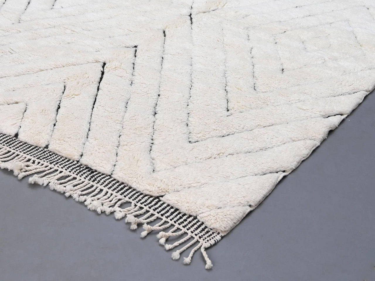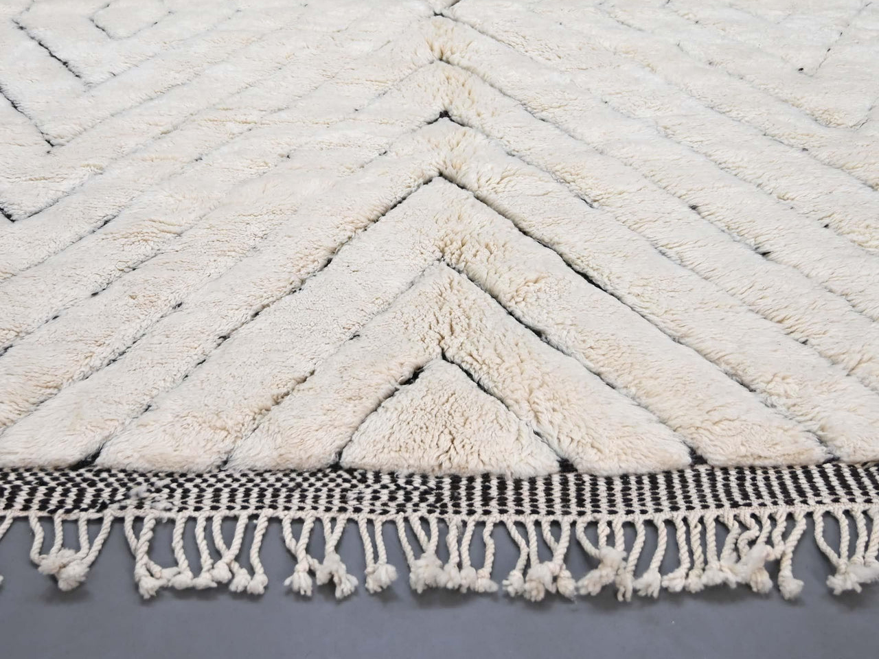 Moroccan Rug, Beni Ourain rug 100% thick and natural wool with fringed finishes on the edges. Exceptional and unique piece handmade by Berber women on wooden looms.