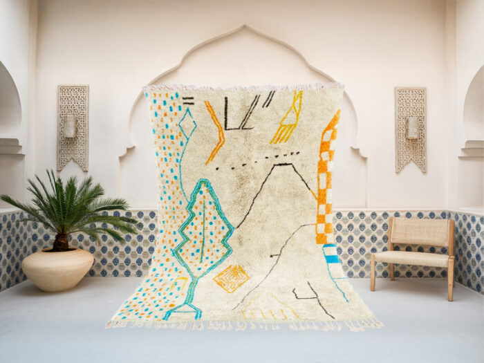 Our luxurious – Tament Rug is a standout piece from our handwoven collection, crafted with precision and care by talented Berber artisans from the High Atlas Mountains in Morocco. Renowned for their exceptional craftsmanship, Azilal rugs are made using a blend of natural wool and cotton, offering a distinctive texture and vibrant color combinations that elevate any interior design.