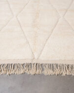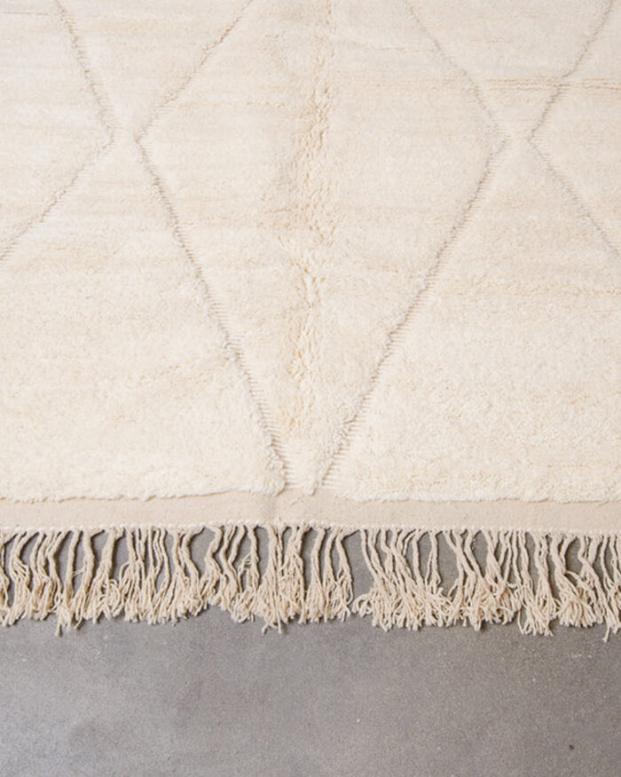 Beni Ourain rug 100% thick and natural wool with fringed finishes on the edges. Exceptional and unique piece handmade by Berber women on wooden looms.
