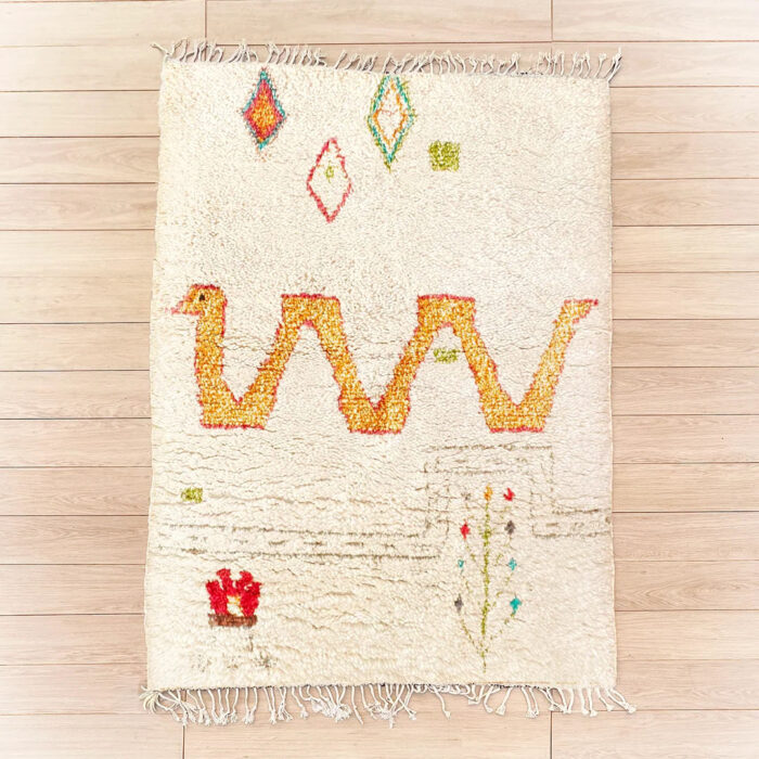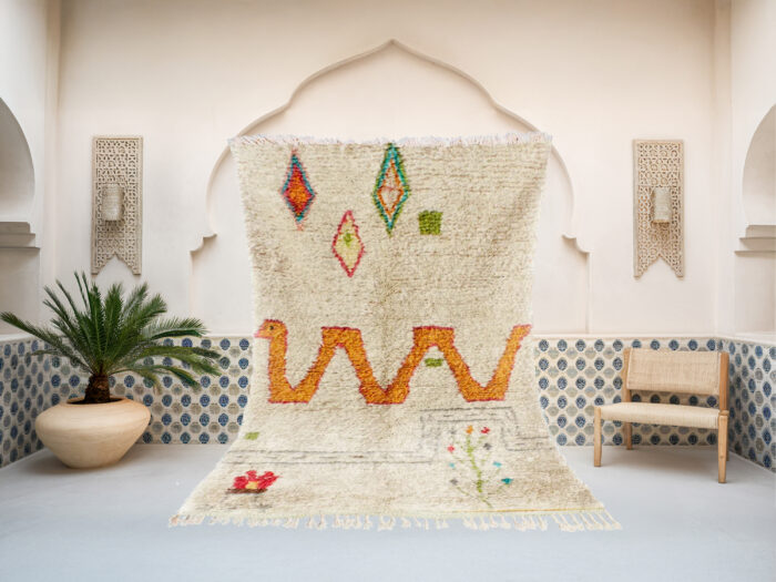 Our luxurious – Tazeggwaght Rug is a standout piece from our handwoven collection, crafted with precision and care by talented Berber artisans from the High Atlas Mountains in Morocco. Renowned for their exceptional craftsmanship, Azilal rugs are made using a blend of natural wool and cotton, offering a distinctive texture and vibrant color combinations that elevate any interior design.