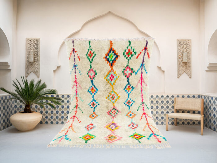 Our luxurious – Tazegzawt Rug is a standout piece from our handwoven collection, crafted with precision and care by talented Berber artisans from the High Atlas Mountains in Morocco. Renowned for their exceptional craftsmanship, Azilal rugs are made using a blend of natural wool and cotton, offering a distinctive texture and vibrant color combinations that elevate any interior design.