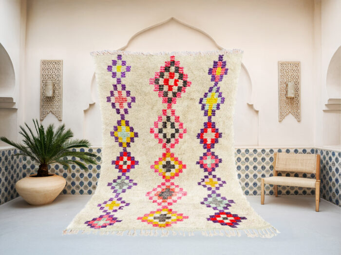 Our luxurious – Tifawt n Tudert Rug is a standout piece from our handwoven collection, crafted with precision and care by talented Berber artisans from the High Atlas Mountains in Morocco. Renowned for their exceptional craftsmanship, Azilal rugs are made using a blend of natural wool and cotton, offering a distinctive texture and vibrant color combinations that elevate any interior design.