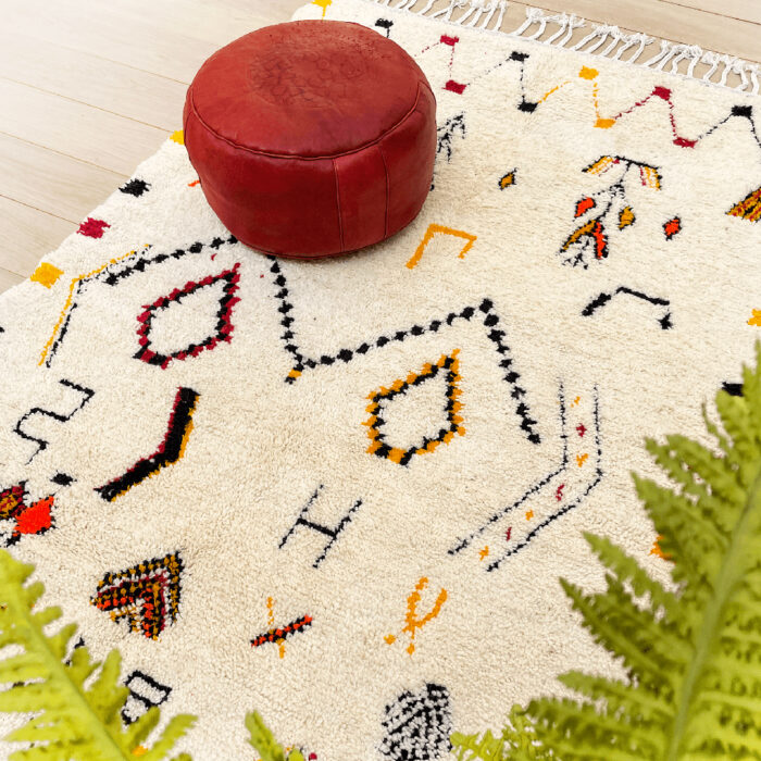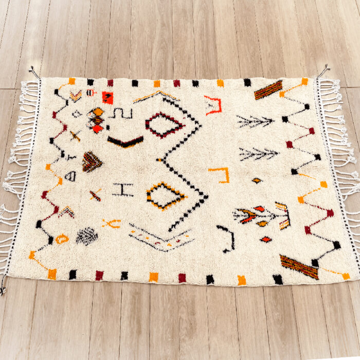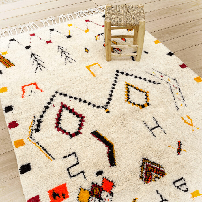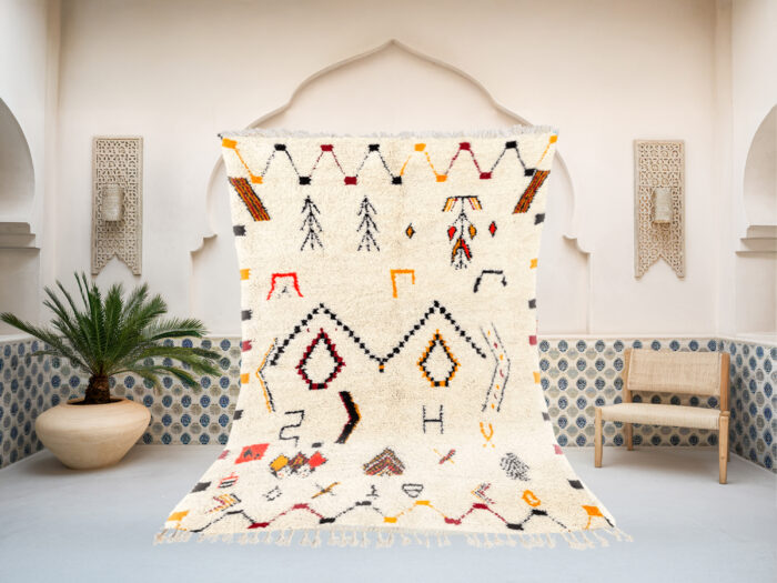 Our luxurious – Tinfass Rug is a standout piece from our handwoven collection, crafted with precision and care by talented Berber artisans from the High Atlas Mountains in Morocco. Renowned for their exceptional craftsmanship, Azilal rugs are made using a blend of natural wool and cotton, offering a distinctive texture and vibrant color combinations that elevate any interior design.