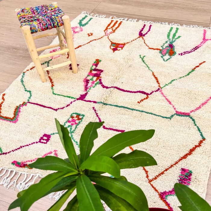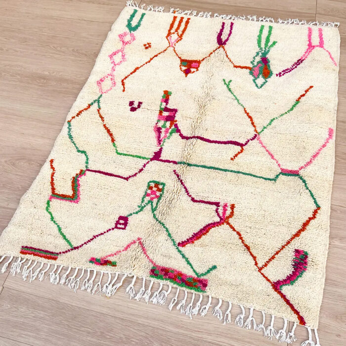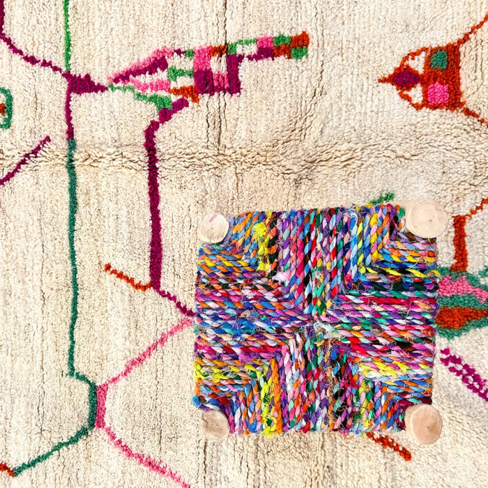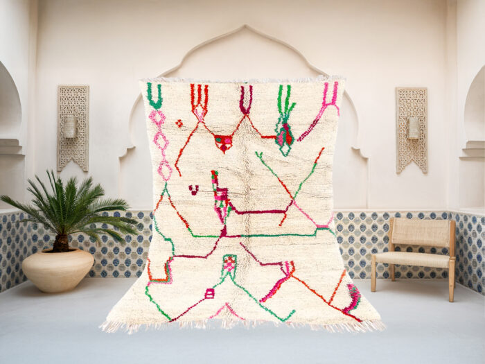 Our luxurious – Tizemt Rug is a standout piece from our handwoven collection, crafted with precision and care by talented Berber artisans from the High Atlas Mountains in Morocco. Renowned for their exceptional craftsmanship, Azilal rugs are made using a blend of natural wool and cotton, offering a distinctive texture and vibrant color combinations that elevate any interior design.