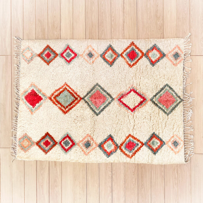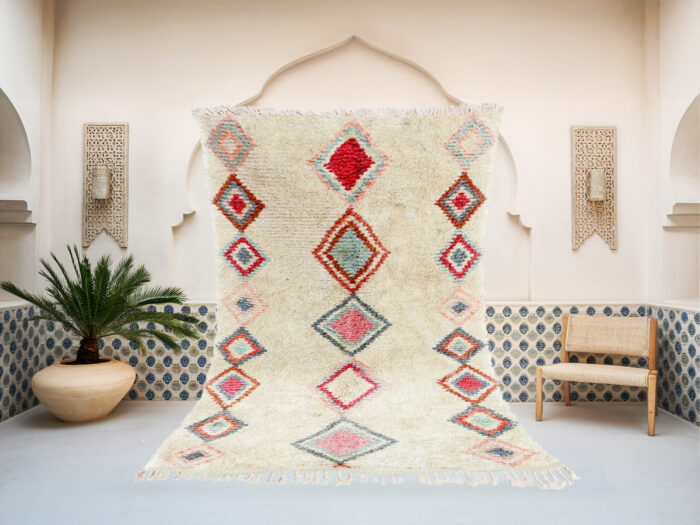 Our luxurious – Tiziri n Tafat Rug is a standout piece from our handwoven collection, crafted with precision and care by talented Berber artisans from the High Atlas Mountains in Morocco. Renowned for their exceptional craftsmanship, Azilal rugs are made using a blend of natural wool and cotton, offering a distinctive texture and vibrant color combinations that elevate any interior design.