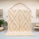 Beni Ourain rug 100% thick and natural wool with fringed finishes on the edges. Exceptional and unique piece handmade by Berber women on wooden looms.