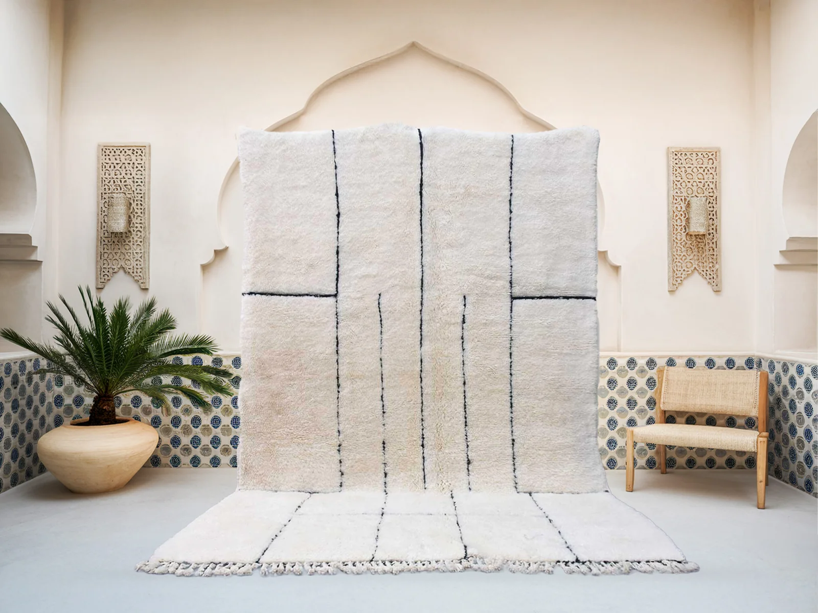 Authentic Beni Ouarain rugs originate from the Beni Ouarain tribes of Morocco. Traditionally woven for warmth during cold mountain winters, these rugs are known for their thick natural wool, ivory backgrounds, and minimalist black or brown geometric lines.